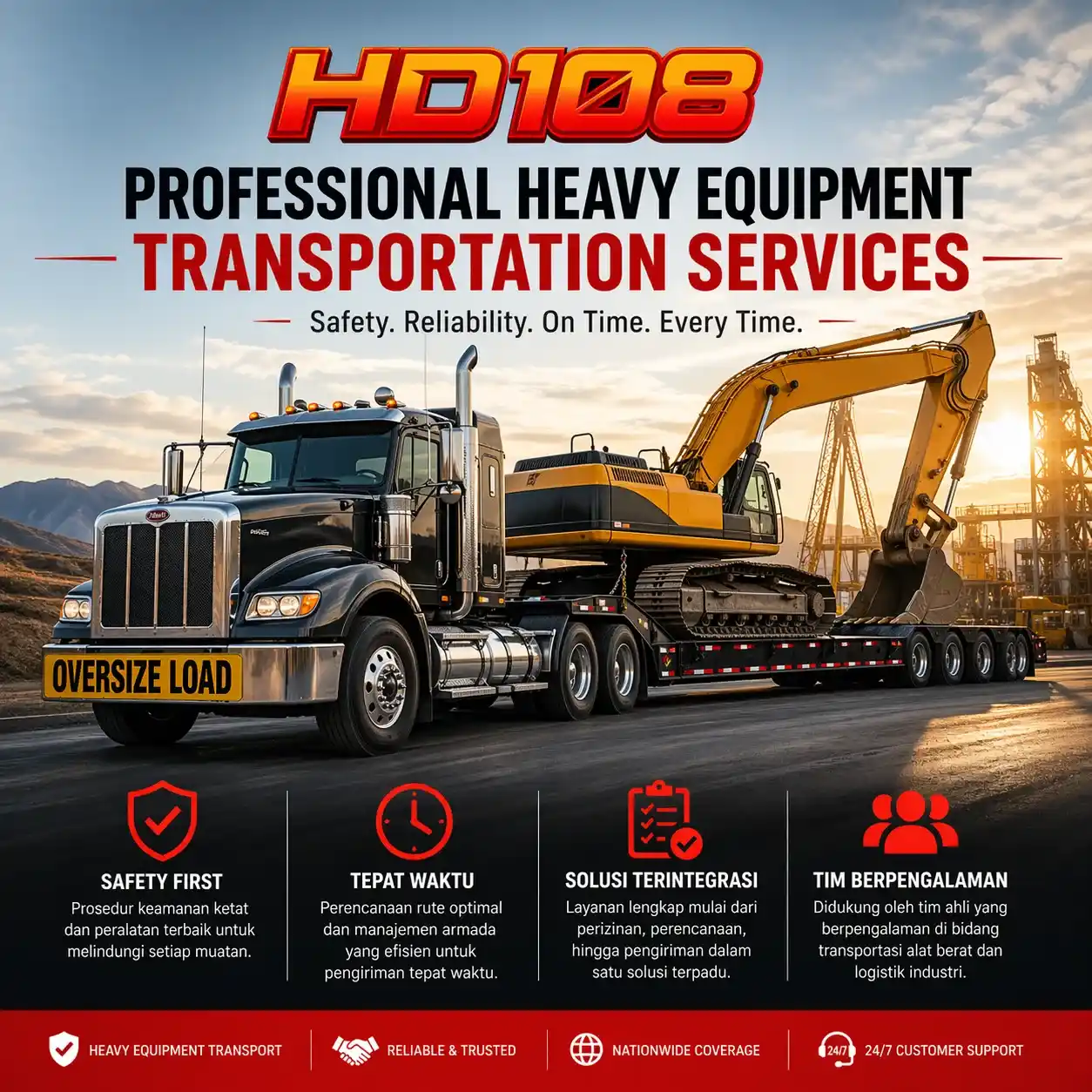 HD108 adalah layanan transportasi alat berat profesional yang menyediakan solusi pengangkutan aman dan efisien untuk berbagai kebutuhan industri.